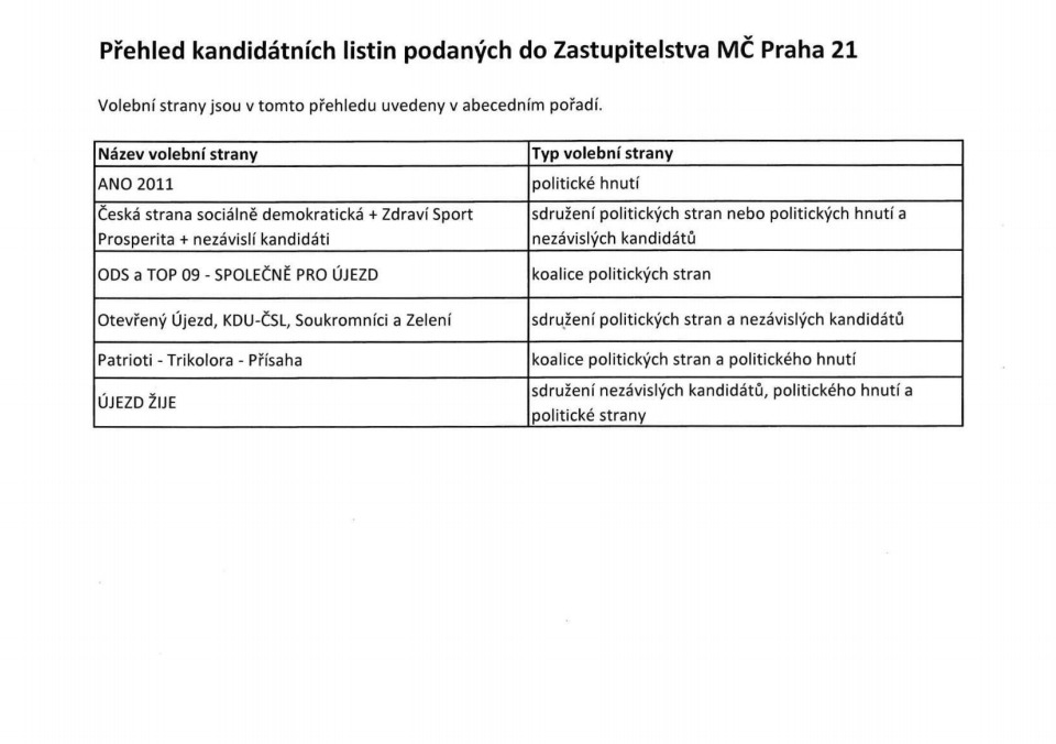 Přehled kandidátních listin podaných do Zastupitelstva MČ Praha 21
