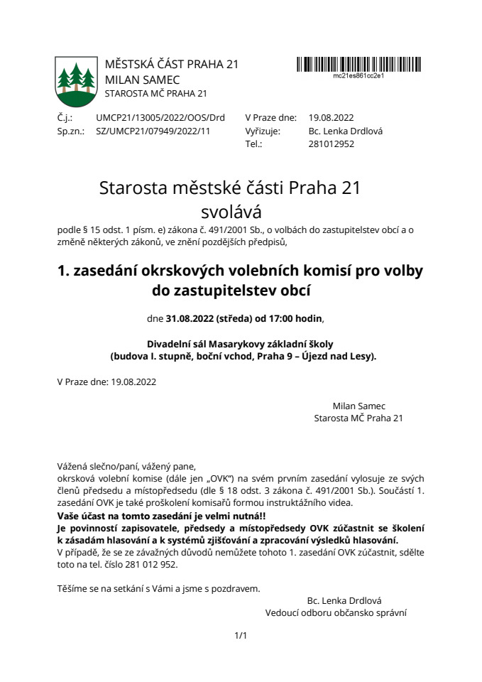 1. zasedání okrskových volebních komisí se uskuteční dne 31. srpna 2022 od 17.00 hod v Divadelním sále Masarykovy základní školy (budova 1. stupně, boční vchod, Praha 9 – Újezd nad Lesy).