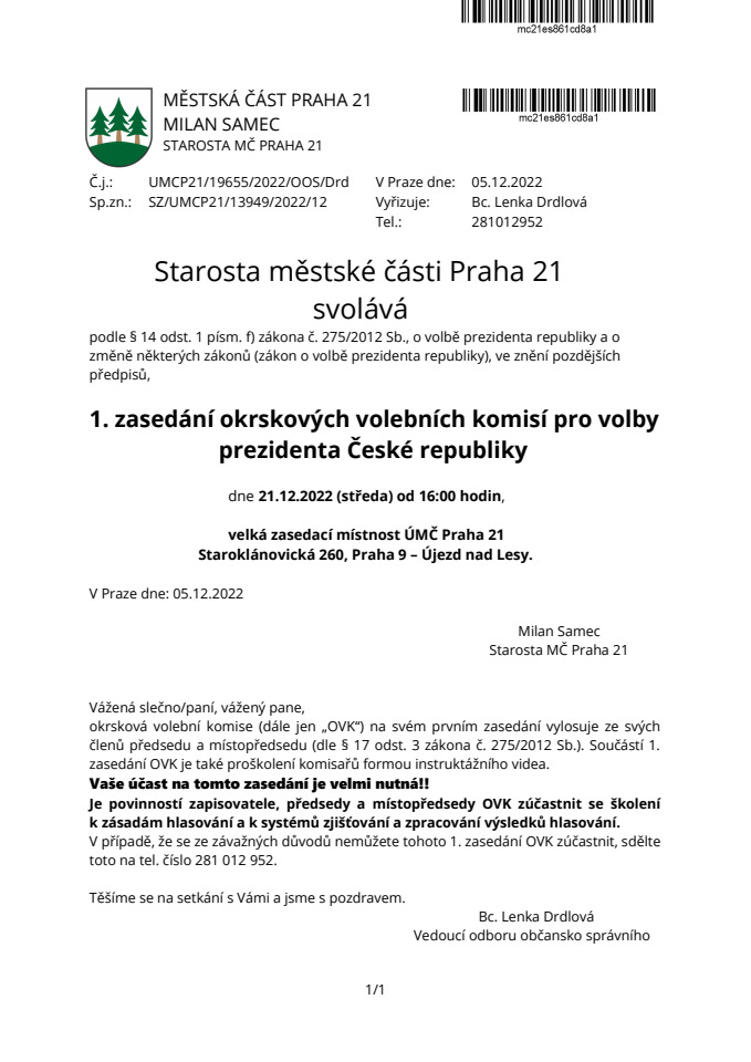 Oznámení o svolání 1. zasedání okrskových volebních komisí v MČ Praha 21