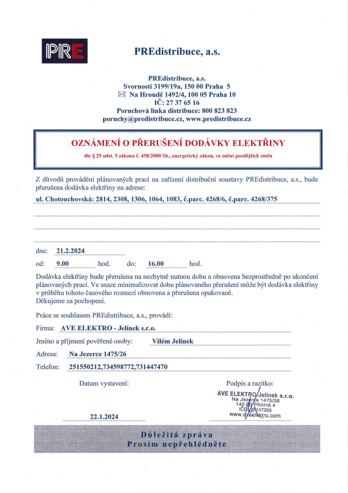 • Oznámení o přerušení dodávky elektřiny