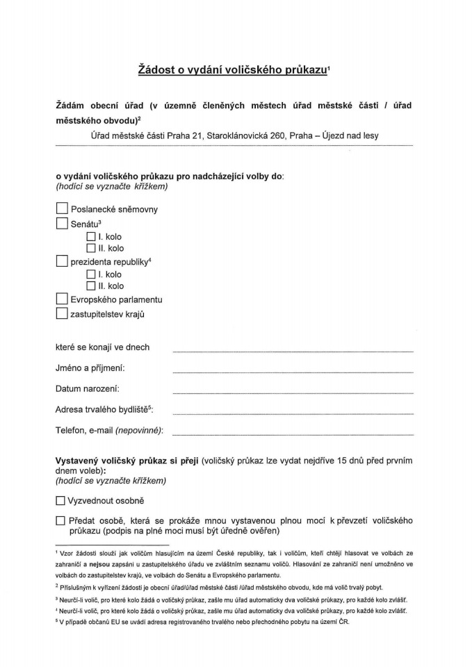 Osobní žádost o vydání voličského průkazu je možné podat u odboru občansko správního ÚMČ Praha 21, úsek občanských průkazů, cestovních dokladů, evidence obyvatel, budova B, přízemí, tel: 281 012 957. Voličský průkaz předá Úřad městské části Praha 21 nejdříve 15 dnů přede dnem voleb, tj. 23. května 2024, osobně voliči nebo osobě, která se prokáže plnou mocí s ověřeným podpisem voliče žádajícího o vydání voličského průkazu, anebo jej voliči zašle na jím uvedenou adresu