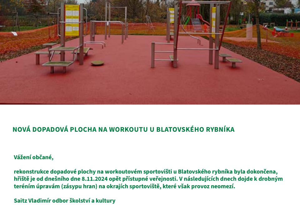 rekonstrukce dopadové plochy na workoutovém sportovišti u Blatovského rybníka byla dokončena,