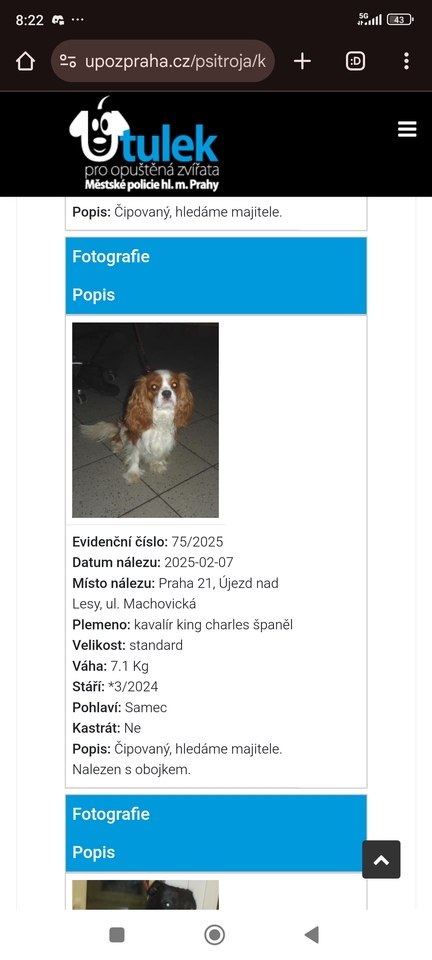 Do Pražského Útulku Troja se dostal pes Kavalír, který byl nalezen v ulici Machovická.