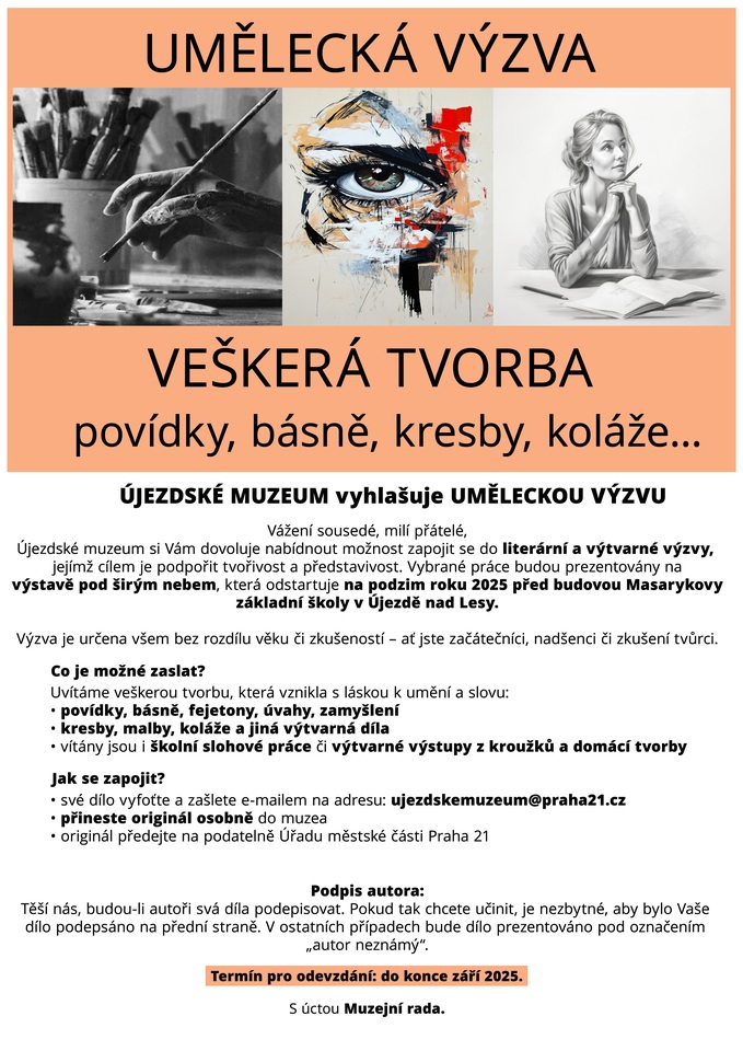 Újezdské muzeum si Vám dovoluje nabídnout možnost zapojit se do literární a výtvarné výzvy. Je to příležitost, která umožňuje nejen začínajícím umělcům odprezentovat svá díla ve veřejném prostoru. Zašlete nám svoje povídky, básně, fejetony či kresby, malby, koláže nebo jiná literární a výtvarná díla a můžete se těšit na jejich odhalení na výstavě pod širým nebem.