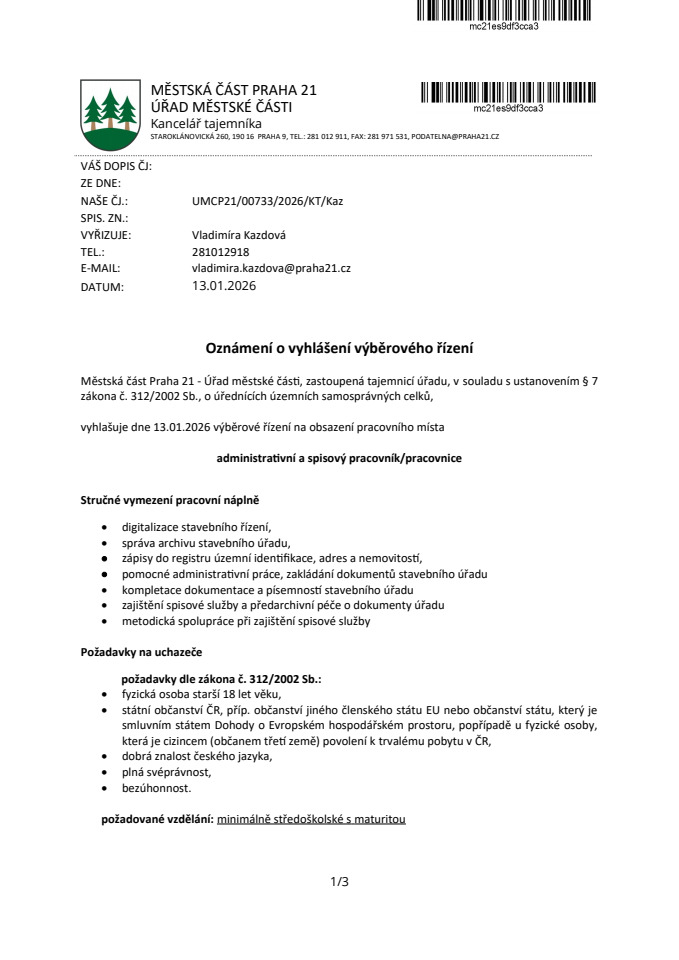 ÚMČ Praha 21 vyhlašuje výběrové řízení na obsazení pracovního místa administrativní a spisový pracovník/pracovnice – ÚMČ Praha 21.
