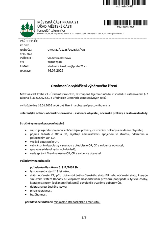 ÚMČ Praha 21 vyhlašuje výběrové řízení na obsazení pracovního místa referent/ka odboru občansko-správního – evidence obyvatel, občanské průkazy a cestovní doklady – ÚMČ Praha 21.