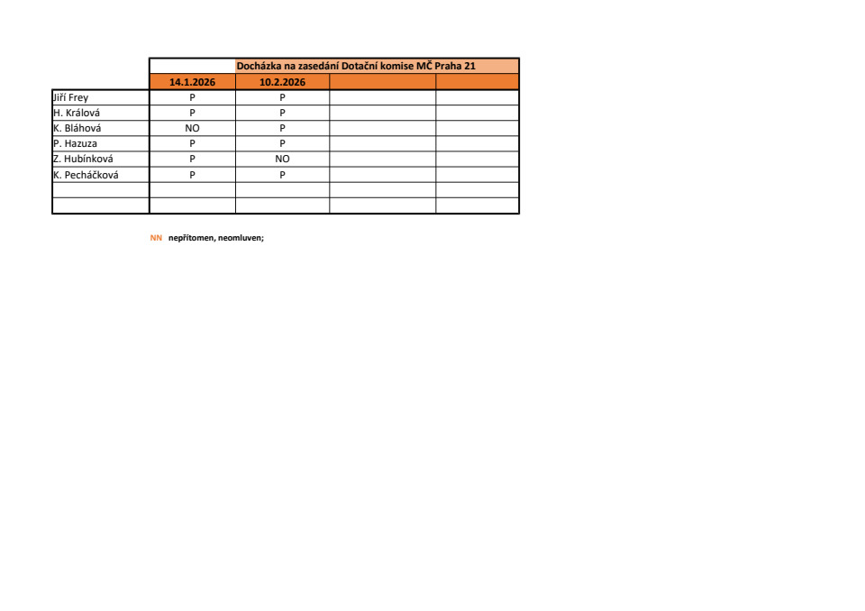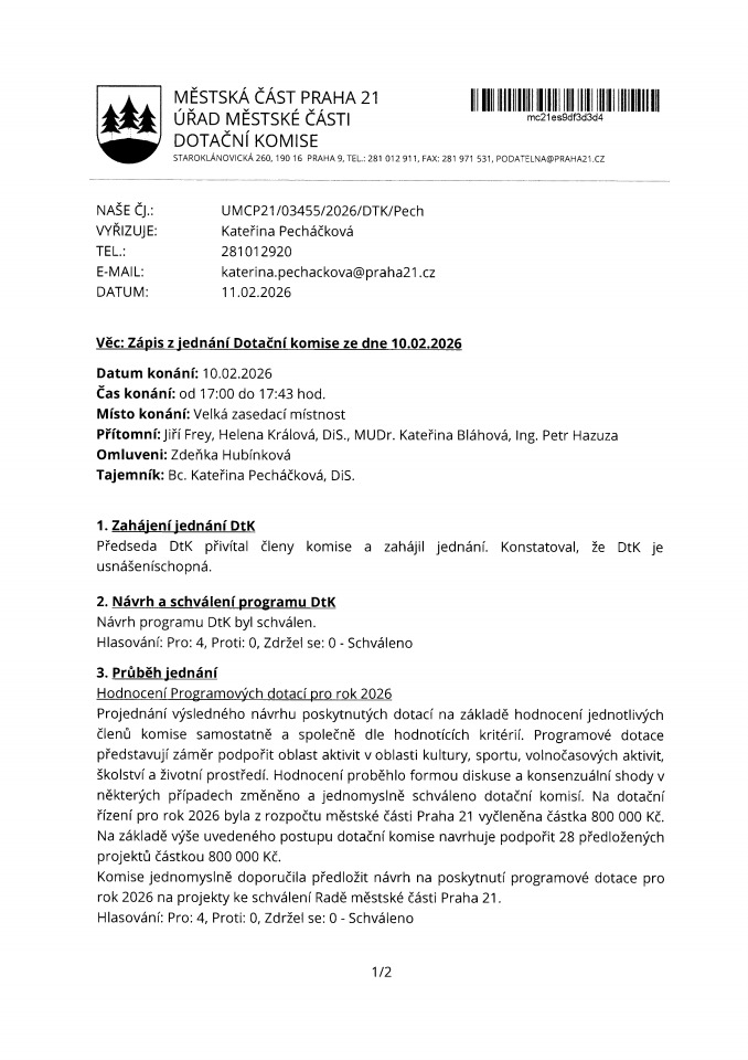 - Rada MČ Praha 21 projednala a schválila usnesením č. RMČ/93/1270/25 ze dne 29.10.2025 programové dotační řízení MČ Praha 21 v oblasti kultury, sportu, volnočasových aktivit, školství a životního prostředí pro rok 2026. RMČ Praha 21 usnesením č. RMČ/93/1269/25 ze dne 29.10.2025 jmenovala Dotační komisi pro programové dotace na funkční období 1 roku.