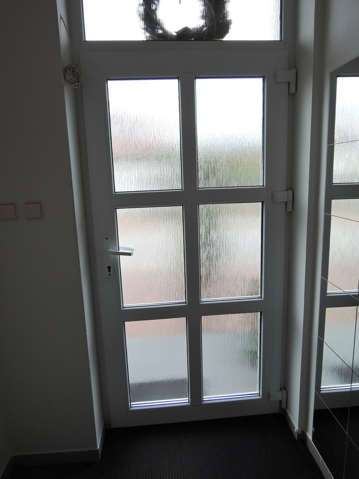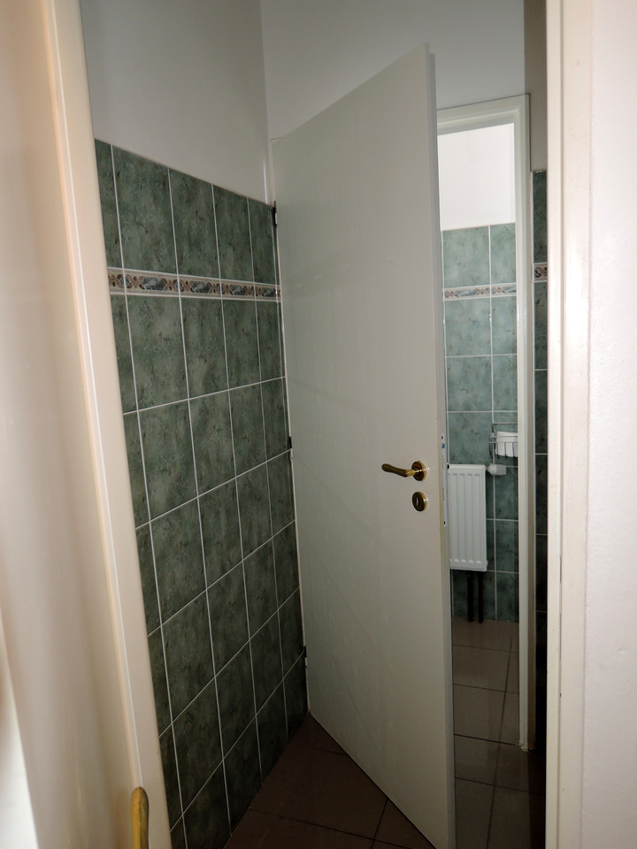 Prostor před vstupem tvoří zámková dlažba s výraznějším sklonem (až 10 %). Před vstupem do objektu je +1 schod (výška 19 cm, hloubka 108 cm, šířka 174 cm). Jednokřídlé vstupní dveře (šířka 95 cm) se otevírají mechanicky směrem dovnitř. Zvonková signalizace není k dispozici. Ze zádveří (šířka 157 cm, hloubka 188 cm) vedou do čekárny další jednokřídlé dveře (šířka 90 cm), které se otevírají mechanicky směrem ze zádveří.