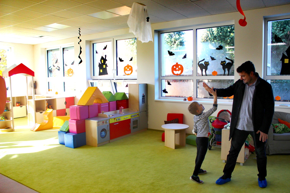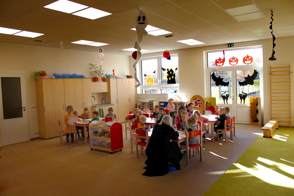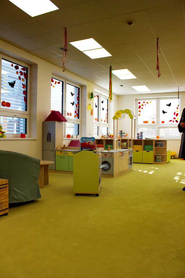 Ve vstupní hale uprostřed se nachází vrátnice (pult výška 77 cm). Po obou stranách jsou šatny pro žáky ZŠ s otevřenými průchody do páteřní chodby v přízemí, kde jsou dvě šatny MŠ. Vstupní dveře do šaten jsou jednokřídlé (šířka 80 cm) a otevírají mechanicky směrem dovnitř.3. patro, ve kterém sídlí MŠ, je přístupné dvěma schodišti a osobním výtahem na čip. K hlavnímu vstupu vede pouze schodiště. Dvoukřídlé dveře (šířka 2x 75 cm) se otevírají mechanicky směrem ven. Zvonková signalizace u dveří chybí. Vedlejší uzamčený vstup do MŠ je z druhé schodišťové chodby s výtahem. Dvoukřídlé dveře (hlavní křídlo šířka 71 cm, vedlejší křídlo šířka 84 cm) se otevírají mechanicky směrem do schodišťové chodby. MŠ je rozdělena na čtyři oddělení. Ke každé třídě přiléhá vlastní umývárna, uzpůsobená dětem. Dveře tříd a průchody v celém objektu s výjimkou hlavního křídla vstupních dveří jsou širší než 80 cm. Manipulační prostor v interiéru je dostatečný.