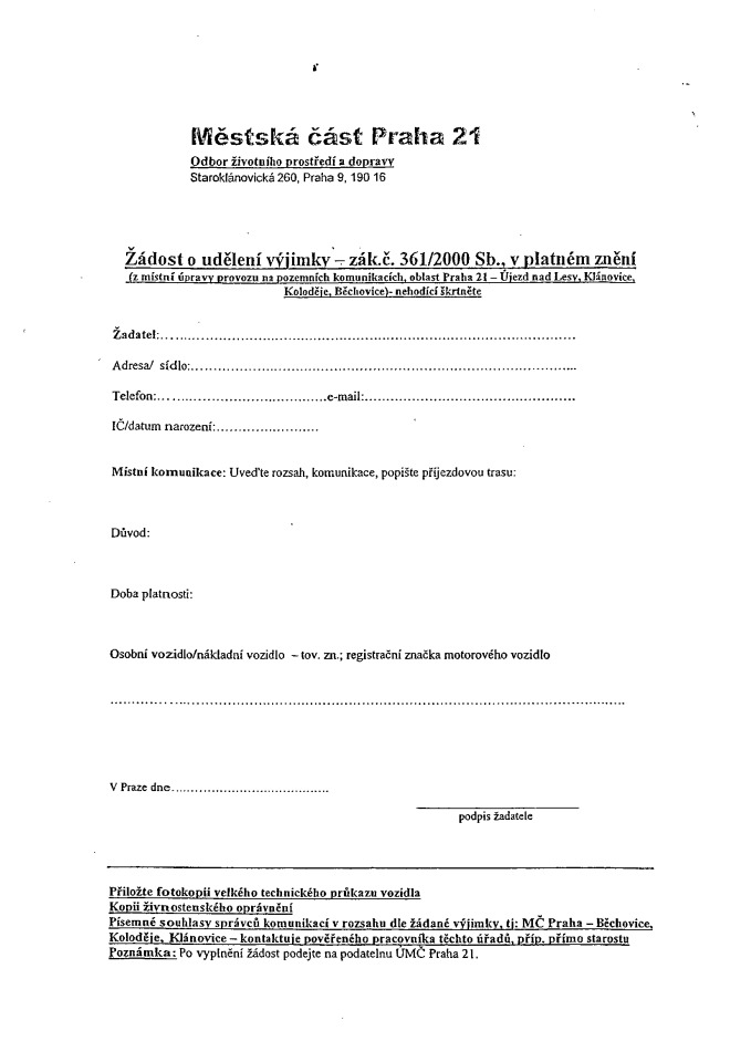 Pro vydání rozhodnutí o udělení výjimky je nutné stanovit přesně příjezdovou a odjezdovou trasu všech dotčených vozidel, účel a dobu po kterou je nutné výjimku vydat. Dále je nutno uvést jméno a příjmení toho, kdo bude za dodržení podmínek udělené výjimky z provozu zodpovídat, včetně telefonního spojení. U právnických osob jejich obchodní jméno, sídlo a IČO. Dále je potřeba předložit SPZ všech dotčených vozidel včetně technických průkazů. Další předepsané náležitosti jsou uvedeny ve formuláři žádosti. Formulář žádosti je k dispozici na odboru životního prostředí a dopravy nebo na www stránkách.