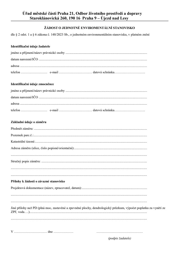 Vyplněnou žádost včetně náležitostí, které jsou uvedeny v žádosti (nejlépe jedno orazítkované paré projektové dokumentace) zaslat na Odbor životního prostředí Úřadu městské části Praha 21.
